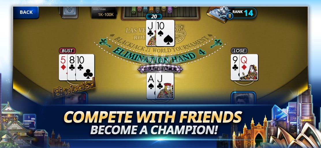 ▶ Compete in Tournament Mode Real Blackjack Tournaments with Official Casino Rules! Multi-level Tournaments: Rio, Las Vegas, Sydney, Macau, Tokyo Compete with 2 other players in 8 hands Hand 4 is an Elimination Hand One chance to exchange a card at the most crucial moment See how you stack up to other players around the world ▶ Get Lucky in Spin & Go Mode The top chip-holder gets the prize! Open to all levels 4 rounds with no elimination hands Compete with 3 other players ▶ Hone your Skills in Free Bet Mode Play with friends and people around the world Multi-Bets & Pair Bets: Bet in up to 3 places simultaneously Double Pay Gauge: A full gauge doubles your pay for the next hand Play with friends at your own private blackjack table Rank up and play more advanced tables: Beginners/Amateurs/Advanced/Bigshots/Highrollers/Billionaires ▶ Play against friend 1 vs 1 Mode Add friends in game and challenge them! Play VS mode to show the real blackjack winner! Four rounds with no elimination hands Challenge your friend one on one! ▶ Earn Free Bonuses & Complete Missions Connect with Facebook: Get $500,000 in chips Welcome Bonus: $1,000,000 in chips Time Bonus: $50,000 in chips every 3 Hours Daily Bonuses: Chips up to $3,500,000 Weekly Bonus: Tournament Ticket or chips up to $1,500,000 Daily / Special Missions: Free Chips upon completion Various Seasonal Events & Special Missions! For suggestions and help, please contact us at: support@neon-games.zendesk.com Like Us on Facebook for Updates and Free Prizes: https://www.facebook.com/WBTfan *Disclaimer: The games are intended for an adult audience. Our games are meant for amusement and entertainment purpose only. The games do not offer "real money gambling" or an opportunity to win real money or prizes. Practice or success at social casino gaming does not imply future success at "real money gambling.”