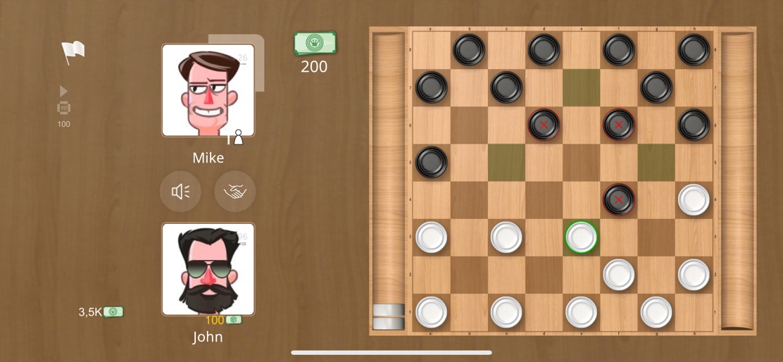 Play with friends online Checkers (shashki, draughts, dama) is a well-known board game with simple rules. Play Checkers Online by the rules of the most popular types of draughts: International 10×10 and Russian 8×8. Features of Checkers Online: - No ads - Online tournaments - You can get free credits few times a day - Play only online with live players - Possibility to offer a draw - Russian checkers 8×8 - International checkers 10×10 - User-friendly and minimalistic interface - Ability to deploy the device horizontally or vertically - Private (closed) games with a password and the ability to invite a friend - Ability to repeat the game with the same players - Linking your account to iCloud account, you will not lose your progress and credits - Friends, chats, emoticons, achievements and leaderboards Russian checkers 8×8 Move and capture rules: - White starts the game - Checkers move only on dark squares - It is required to hit a checker if there is a possibility - It is allowed to hit a checker both forward and backward - The king moves and hits on any square of the diagonal - When capturing a checker, the rule of the Turkish strike is applied (in one move, an opponent's checker can be beaten only once) - If there are several capture options, you can choose any of them (not necessarily the longest) - When a checker reaches the edge of the opponent's field and becomes a king, it can immediately play by the rules of a king, if possible. When a draw is declared: - If a player has checkers and three (or more) kings at the end of the game, against one of the opponent's king, on his 15th move (counting from the moment the balance of forces is established) he will not take one of the opponent's king - If in a position in which both opponents have kings, the balance of forces has not changed (i.e., there was no capture, and not a single checker became a king) during: in 4 and 5 piece endings – 30 moves, in 6 and 7 piece endings – 60 moves - If a player, having three checkers at the end of the game (three kings, two kings and a checker, a king and two checkers, three simple checkers) against one opponent's king located on the "high road", cannot take the opponent's king with his 5th move - If during 15 moves the players made moves only with kings, without moving simple checkers and without taking - If the same position is repeated three (or more) times (the same arrangement of checkers), and the turn of the move each time will be behind the same side. International checkers 10×10 Move and capture rules: - White starts the game - Checkers move only on dark squares - It is required to hit a checker if there is a possibility - It is allowed to hit a checker both forward and backward - The king moves and hits on any square of the diagonal - When capturing a checker, the rule of the Turkish strike is applied (in one move, an opponent's checker can be beaten only once) - The majority rule works (if there are several options for a capture, taking the largest number of checkers is required) - If a simple checker in the process of capturing reaches the edge of the opponent's field and can hit further, then it continues the move and remains an ordinary checker (without turning into a king) - If a simple checker reaches the edge of the opponent's field by a move (or in the process of capturing), it turns into a king and stops, according to the rules of a king, it will be able to play on the next move