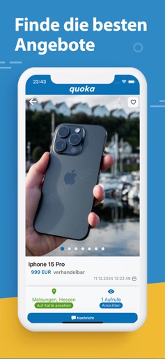 Quoka - Deine Adresse zum Kaufen und Verkaufen von gebrauchten Dingen -Anzeigen einstellen Nutze die Quoka-App, um mühelos Anzeigen zu schalten und sofort mit potenziellen Käufern für Deine Produkte oder Dienstleistungen in Kontakt zu treten! - Suche speichern und auf dem neuesten Stand bleiben Personalisiere Deine Suche und erhalte Benachrichtigungen zu den neuesten Angeboten und Anzeigen. - Schnell und einfach Anbieter kontaktieren Nimm unkompliziert Kontakt zu Verkäufern auf - per Anruf, SMS oder Push-Nachricht direkt über die App. -Merkliste erstellen und Lieblingsanzeigen im Blick behalten Greife bequem auf alle Anzeigen in Deiner Merkliste zu und erhalte Benachrichtigungen, wenn z.B. der Preis reduziert wird. -Anzeigen schnell und einfach teilen Teile Deine Anzeigen mit Freunden und erweitere so die Reichweite Deiner Angebote. - Einfaches Hochladen von Bildern Werte Deine Anzeigen auf und lade problemlos Bilder von Deinem Mobiltelefon oder der Galerie hoch.
