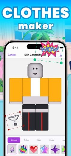 This app is a great mobile app for creating unique looks for your characters from the game universe. Forget about boring, gray models and immerse yourself in the virtual world of your own creativity! Now you have the opportunity to make your dreams come true and completely transform your characters. Start from scratch or pick from hundreds of pre-made templates! ~~~ Features ~~~ – Hundreds of clothing templates; – A wide variety of bright textures and stickers; – Easy and intuitive 3D preview mode; – Import your designs directly to the mobile version of the game. ~ 3D outfit editor for your skin ~ Create your look in 3D with ease! Use all necessary tools to make original clothes for game characters in a few clicks. Color your appearance with a brush and use the eraser to turn pixels to their original color. And the undo and redo functions allow you to revert and repeat any recent changes you made. ~ Multiple-layer system ~ This system will allow you to work on multiple layers while creating the style of your avatar. Use the first layer to fill your outfit with a single color or texture, the second – to design your look in your own way, and the third – to add some emotions with bright stickers. Let your fantasy run wild! ~ Use an extensive template gallery ~ Stand out among other players! In our app you will find a library with hundreds of amazing template options to create your own appearance. Choose the template you want and use the tools you need to edit the look you've created, then add cool textures and stickers to add even more creativity and color to your work. Turn a gray silhouette into a bright and beautiful look! ~ View avatars in 3D ~ Use the convenient 3D view mode to see your unique skin style directly on the character model. Try to look at the character from different angles, you may want to make changes. ~ Import your designs to the game ~ In our application, detailed instructions are available for transferring the images you created directly into the game. ~ Export character for PC version ~ Create the clothes for your avatars and use them for both the mobile version and the standard PC versions, because our app conveniently allows you to save your designs in PNG format. Put aside doubts! Download our app and design the perfect look for your character! ATTENTION: 1. You need an internet connection to download the content! 2. To download materials correctly, you will need to have the official mobile version of the game on your device! DISCLAIMER This application is not affiliated with Roblox Corporation. All trademarks, logos and brand names are the property of their respective owners. SUBSCRIPTION INFORMATION Subscribe and get: 1. 1000+ options of avatars. 2. 500+ rare stickers. 3. Full features 3D editor. Make your life easier with premium access: - Paid subscription is divided into 3 types: weekly, monthly and annual. - The cost of a weekly paid subscription is $9.99. Monthly - $14.99. Annual - $49.99. - The amount will be charged to your Apple ID account at confirmation of purchase. - You can cancel a subscription or trial period at any time, but no later than 24 hours before the end of the current period. OTHERWISE it will be automatically renewed. - Your account will be charged for renewal within 24-hours prior to the end of the current period. - After payment, you can manage your subscription and turn off auto-renewal in your account settings. - Any unused portion of the free period will be forfeited upon purchase of the subscription - Please read our privacy policy and EULA https://pixelvoidgames.com/policy.html https://pixelvoidgames.com/terms_of_use.html