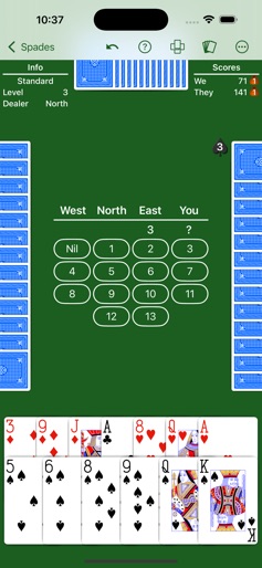 Ready for a challenge? Six AI levels. Play Partnership or Mirror, Suicide, Whiz, and Solo (Cutthroat) with AI guidance, a card counter, and detailed analysis tools. Whether you’re a seasoned pro or learning Spades for the first time, Spades – Expert AI is a great way to play, learn, and master this classic trick-taking card game. Learn smarter, play better, and master Spades with powerful AI partners and opponents, plus in-depth analysis tools. Play anytime, even offline. Extensive customization options let you enjoy your favorite rules. CHALLENGING AND ENJOYABLE FOR ALL New to Spades? Learn as you play with the NeuralPlay AI, which offers real-time suggestions to guide your moves. Build your skills hands-on, explore strategies, and improve your decision-making in a single-player experience that teaches you every step of the game. Already an expert? Compete against six levels of advanced AI opponents designed to challenge your skills, sharpen your strategy, and make every game competitive, rewarding, and exciting. Enjoy Partnership Spades, or challenge yourself with popular preset variants like Mirror Spades, Suicide Spades, Whiz Spades, Solo (Cutthroat) Spades, and more! KEY FEATURES Learn and Improve • AI guidance: Receive real-time insights whenever your plays differ from the AI’s choices. • Built-in card counter: Strengthen your counting and strategic decision-making. • Trick-by-trick review: Analyze every move in detail to sharpen your gameplay. • Replay hand: Review and replay a deal to practice and improve. Convenience and Control • Offline play: Enjoy the game anytime, even without an internet connection. • Undo: Quickly correct mistakes and refine your strategy. • Hints: Get helpful suggestions when you’re unsure of your next move. • The Rest Are Mine (TRAM): End the hand early when your cards are unbeatable. • Skip hand: Move past hands you’d rather not play. Progression and Customization • Six AI levels: From beginner-friendly to expert-challenging. • Detailed statistics: Track your performance and progress. • Customization: Personalize the look with color themes and card decks. RULE CUSTOMIZATIONS Explore different ways to play with flexible rule options, including: • Trump: Play with spades only, or add jokers and/or deuces as high trump. • Nil: Allow nil, disallow nil, or use a zero bid. • Blind nil: Enable when behind by 100, behind by 200, always, or never. • Nil / blind nil bonus: Set to 100/200 or 50/100 points. • Blind bids (non-nil): Enable when behind by 100, behind by 200, always, or never. • Nil passing: Exchange 0–4 cards with your partner. • Blind nil passing: Exchange 0–4 cards with your partner. • Minimum team bid: Choose 2–5, or no minimum. • Bag penalty: 10 bags = −100, 5 bags = −50, or no penalty. • Bag (overtrick) points: +1, 0, −1, or −10 per bag. • Failed bid penalty: 10× bid, 10× tricks short, or no penalty. • Failed nil overtricks: Count as bags, not bags, or apply to partner’s bid. • 10-for-200: Set the bonus for a combined team bid of 10 or more. • Initial lead: Left of dealer, Two of Clubs leads, or everyone plays lowest club. • Trump first trick: Allow or disallow trumping on trick one. • Leading spades: Lead only after spades are broken, or allow anytime. • Must beat: Require players to beat the winning card when able (on/off). DOWNLOAD TODAY Play, learn, and master Spades – Expert AI. Enjoy a single-player Spades experience designed for practice, strategy, or casual play. Whether you want to improve your skills or relax with an offline card game, play your way with smart AI opponents, customizable rules, and a fresh challenge every game.