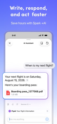 Create Screenshots Like Spark AI Email & CalendarReclaim your time and focus with Spark — the AI-powered email app loved by millions. Declutter your inbox, manage your calendar, and move through emails faster than ever. “Best of the App Store” – Apple “It’s a combination of polish, simplicity, and depth.” – FastCompany “You can create an email experience that works for you.” – TechCrunch MANAGE MULTIPLE EMAIL ACCOUNTS Connect all your emails — including Gmail, Microsoft Outlook, AOL, Yahoo, Hotmail, IMAP, GMX, and iCloud — in one unified inbox. STAY ORGANIZED WITH SMART INBOX Keep personal and high-priority emails up top — newsletters and notifications stay neatly grouped below. WORK SMARTER WITH SPARK +AI Summarize long threads, draft replies, rephrase messages, and adjust tone — all powered by AI. Use your AI Assistant to manage your inbox, translate emails, and keep projects moving. GET MORE DONE WITH EMAIL ESSENTIALS - Mark emails as done or set aside for later - Mute email threads you’re no longer interested in. - Schedule emails to send later — even if your device is off. - Filter with Smart Search and Smart Folders PROTECT YOUR INBOX WITH GATEKEEPER Pre-screen new senders with Gatekeeper and block unwanted contacts instantly. PRIORITIZE EMAILS AND SENDERS Mark what’s important so it’s always at the top of your inbox. Group emails from senders or domains to keep your inbox clean. MANAGE YOUR CALENDAR AND MEETINGS Connect your calendars to stay on top of your day. CONNECT EMAILS TO INTEGRATIONS Connect Spark to apps like Notion, Asana, Things, and 10+ integrations to take action on everything in your inbox. SECURE AND PRIVATE EMAIL Spark encrypts your data, relies on Google Cloud’s secure infrastructure, and is fully GDPR compliant. COLLABORATE WITH YOUR TEAM - Create a team to collaborate on emails. - Co-author emails and discuss content in private comments. - Share secure links to specific emails. - Track read receipts to keep work moving. ENJOY THE ESSENTIALS FOR FREE Try Spark Plus or Spark Pro free for 7 days — or stick with our powerful free plan. Download Spark and reclaim your day. What is Spark? Spark is a cross-platform email client that helps individuals and teams manage their inboxes and calendar with smart, AI-powered tools. It works across all platforms and devices so that you can be more effective, at home, in the office, or on the go. Who is Spark for? Short answer: Anyone who deals with a lot of emails. Spark is perfect for busy professionals, freelancers, and teams who need to stay organized and communicate effectively. It’s also great for individuals who want to manage their personal and work accounts in a unified inbox. Is it difficult to set up? Spark is highly customizable, but also easy to master. You’ll find multiple ways to set up your inbox, swipes, and shortcuts in Settings. Terms of Service: https://sparkmailapp.com/legal/terms Privacy Policy: https://sparkmailapp.com/legal/privacy-app Help: support@sparkmailapp.com
