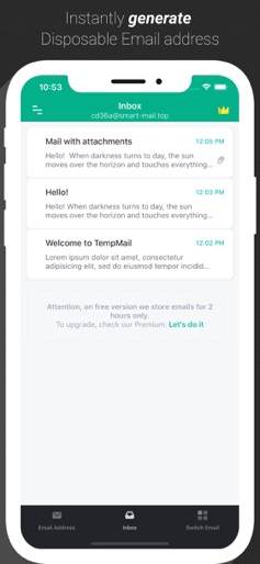 Using Temp-Mail app, you can instantly generate disposable temporary email address and immediately receive emails, including photos or any other attachments. Forget about revealing your real email to everyone. It causes endless spam, advertising mailings, email hacking, and phishing attempts. Keep your real inbox clean and secure. Temp Mail provides a temporary, anonymous, free, disposable email address in 10minute mail style. This app is an advanced version of services also known as 10minutemail, disposable-mail, fake email, guerrillamail, mailinator, getairmail,mohmal mail, throwawaymail, tempmail, tempail, anonymous-mail, spambox, tmail, burnermail, trashmail, 20minute email, and others. But much more robust and with an option to unlock unique premium features. Why use Temp-Mail? ● Hide yourself from spam ● No registration is required ● Generate temporary disposable email ● Protect your privacy and anonymity by not allowing spam in your personal inbox ● Receive multiple or single attachment(s) which can be downloaded from email ● Multi-language ● Emails are constantly being securely deleted forever With Temp-Mail app, you can : ● Generate a new email address instantly ● Copy to clipboard or using QR-code ● Receive emails and attachments automatically ● Get push notification of new emails ● Read incoming emails, including attachments ● Download sources (EML), including attachments ● Quickly delete and/or generate new email addresses Access Extra features with Premium : ● Custom email names ● Multiple mailboxes ● In-app emails view ● Premium domains ● Extended email storage ● Premium support ● No ads If you choose to purchase Temp-Mail Premium, payment will be charged to your iTunes account, and your account will be charged for renewal within 24-hours prior to the end of the current period. Auto-renewal may be turned off at any time by going to your settings in the iTunes Store after purchase. Premium subscription prices can depend on user country, you can see exact terms and prices clearly on purchase screen. Any unused portion of a free trial period will be forfeited when you purchase a subscription. All personal data are kept according to privacy policy, terms of service and available here: https://temp-mail.org/privacy-policy-app https://temp-mail.org/terms-of-service-app Temp-Mail in the press: Our service was mentioned a lot in various publications, youtube videos and social media posts. "Dealing with spam flooding your inbox can be stressful, and you have better things to do than go through and delete them." - Entrepreneur.com "It’s a great way of maintaining some anonymity and keeping your main email free from phishers, scammers, and dodgy data buyers." - TheNextWeb.com "The iOS app gives you a temporary e-mail address so that your 'real' inbox stays clean. This makes it an ideal solution for dealing with newsletters, bots and questionable websites"- Iphoned.nl "However, the more secure method is to take advantage of the Temp Email app. With this app, it will generate a temporary email address that isn't associated with you or your personal information. With this app, you will receive any emails sent to this email address such as any account verifications or confirmation codes." - Gadgethacks.com --- Please note: You cannot send email using this app, only receive. Moreover, our free service handling a couple millions emails per hour. Therefore, we are not able to store emails more than 1-2 hours and the domains may be the subject for change. Do not use temporary emails for registering important accounts or receiving sensitive data. We have no ability to restore emails or domains once removed. Please send us any suggestions or inquiries to : support@temp-mail.org