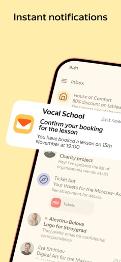 Yandex Mail is a reliable email solution for work and personal correspondences with a built-in translator. Your emails will be safe thanks to built-in virus protection and spam blocking. Work with emails and attachments at any time on any device, and connect all your email accounts. • No frills. Unsubscribe from all unnecessary mailing lists at once by selecting them in the general address list. You don't have to open unwanted emails anymore to unsubscribe from the mailing list. • The app supports working with multiple email accounts at the same time, including Mail, Outlook, Yahoo, Rambler, and iCloud. Read emails from different mailboxes in the same app. • Scan documents or photos using the built-in scanner and attach them to emails without ever leaving the app. • You can work with Yandex Mail without an internet connection. For example, if you lose your connection in the metro, you can still read emails and reply to them, and your messages will be sent automatically when you're back online. • Work with email on the go: see attachments, listen to an email if you're busy, and respond with a template message in one touch. Yandex Mail has a built-in translator for incoming and outgoing messages. You can read an email in a foreign language without any difficulties. • Protect yourself from hacking and spam. To prevent others from reading your emails, enable PIN code login. Yandex Mail smart algorithms reliably protect you from unwanted mailing lists. • Video meetings by link and Calendar. With Telemost, you can arrange work conferences and family chats. Make video calls on any device with no time restrictions. Organize calls directly in the Yandex Disk app without having to switch to Zoom, Skype, WhatsApp, or any other services. And if you add a meeting to Yandex Calendar, all participants will receive a reminder email. • An exclusive address. Connect Yandex 360 Premium to choose a unique address with your name or what you do. An exclusive address lets people know the line of work you're in. For example: alex@business-design.ru. Your email will stand out and get extra attention. • Backups. Restore emails, no matter what happens. For example, if you accidentally lose an important correspondence, it can be restored up to 6 months later, not just 1 month. Email and folder backups are available with Yandex 360 Premium plans. Backups save an unchanged copy of your correspondences. Yandex Mail is a Russian email service — an alternative to Mail, iCloud, and Rambler. Yandex Mail users get 5 GB of free cloud storage on Yandex Disk. Yandex Mail data is securely stored in multiple copies in different data centers in Russia, so you'll always have access to your files. Yandex Privacy Policy: https://yandex.ru/legal/confidential/ Yandex Mail Terms of Use: https://yandex.ru/legal/mail_termsofuse/